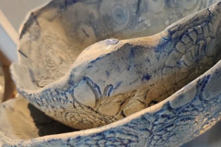 Mon inspiration naît principalement de l’observation de la faune et de la flore. Je crée des empreintes dans l’argile comme pour garder une trace de cette nature en danger.Mes outils, souvent inattendus (têtes de pavots, branches, baies, napperons, tissus) sont récupérés ou glanés et utilisés …
